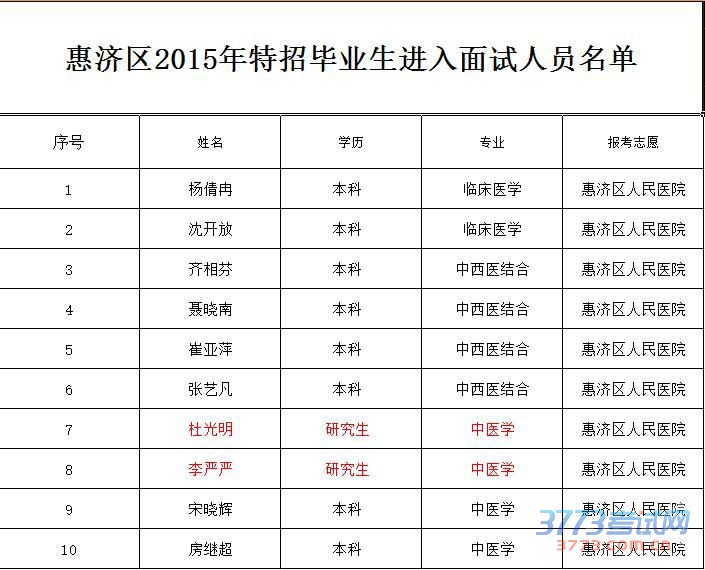 [图文]2015年河南郑州惠济区特招医学院毕业生面试名单