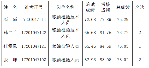 长沙市粮食监察执法队公开招聘,经报名、资格初审、笔试、资格复审、考核等程序,以下4人进入体检,现将进入体检人员名单公示如下,请进入体检的考生保持通讯畅通。
