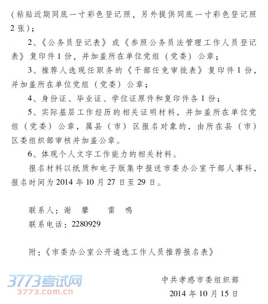 [图文]孝感市2014遴选市委办公室机关工作人员的通知