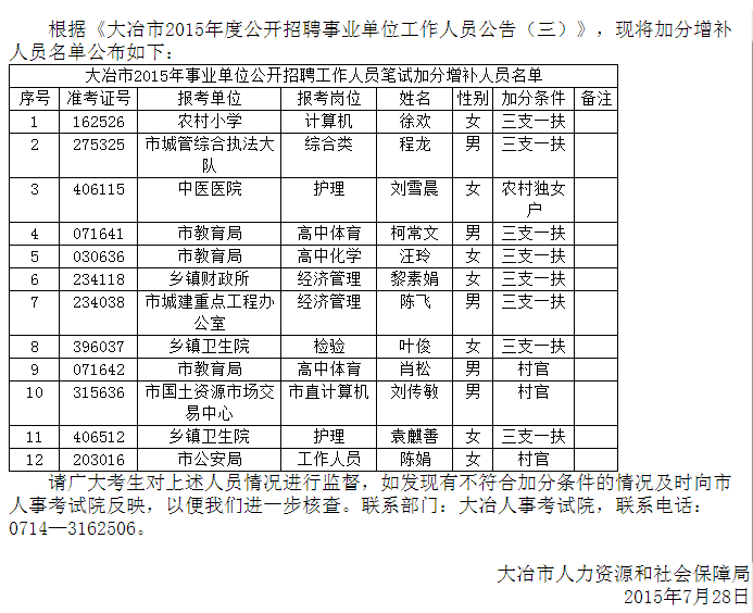 [图文]湖北大冶市2015年招聘事业单位工作人员公告(四)
