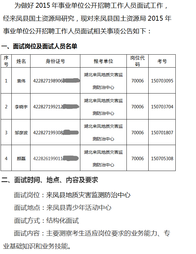 [图文]湖北来凤县国土资源局事业单位2015招聘面试公告