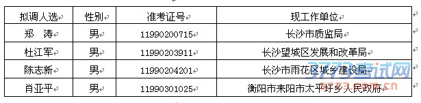 根据中共湖南省委组织部、湖南省人力资源和社会保障厅、湖南省公务员局《2014年省直机关公开遴选公务员公告》及有关规定,经网上报名、笔试、资格审查、专业水平测试、面试、体检、考察等程序,确定郑涛等4名同志为2014年省住房和城乡建设厅公开遴选公务员拟调入人员,现予以公示。