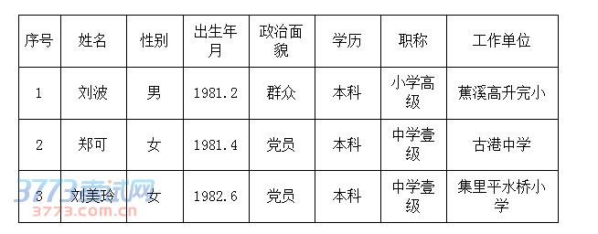 根据《浏阳市教育局关于选聘青少年校外活动中心业务专干的公告》,经个人自愿报名,选聘工作领导小组进行资格审查,评委面试打分,下列3位同志为考察对象,现将基本情况公示如下: