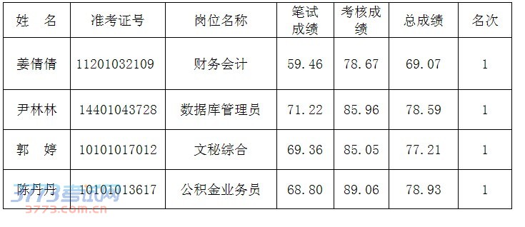长沙住房公积金管理中心公开招聘,经报名、资格初审、笔试、资格复审、考核等程序,以下4人进入体检,现将进入体检人员名单公示如下,请进入体检的考生保持通讯畅通。