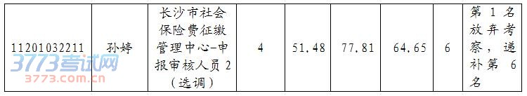 长沙市人力资源和社会保障局所属事业单位2014年公开招聘(选调)工作人员,由于报考长沙市社会保险费征缴管理中心申报审核人员2(选调)岗位有1名考生自动放弃考察资格,导致招聘计划空缺1人,根据招聘简章规定,按综合成绩排名从高到低递补1人进入体检。
