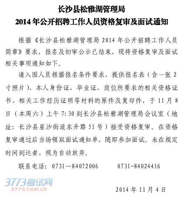 [图文]湖南长沙县松雅湖管理局2014招聘资格复审及面试通知
