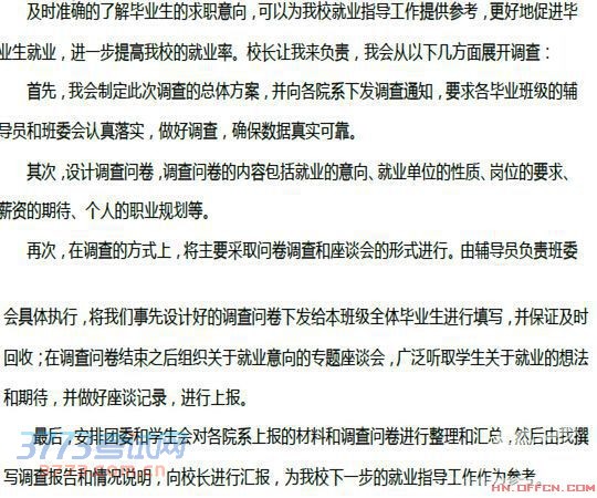 对于本题,一定要明确自己的身份、活动类型及调查内容。调研活动来说,一定要尽力丰富调研形式。学校院系多、专业多、毕业生也多,所选取的调研方式一定要尽可能覆盖到足够多的毕业生,保证调研结果的代表性,问卷调研覆盖面广、成本低、简单易行,能够达到这个目的。虽然有这些优点,但是问卷调研不可避免的一个问题就是收集到的数据比较简单,不够深入,所以在使用问卷这一种方式的时候还必须辅之以访谈调研,选取毕业生代表进行面对面座谈,以保证调研结果的深入性。
