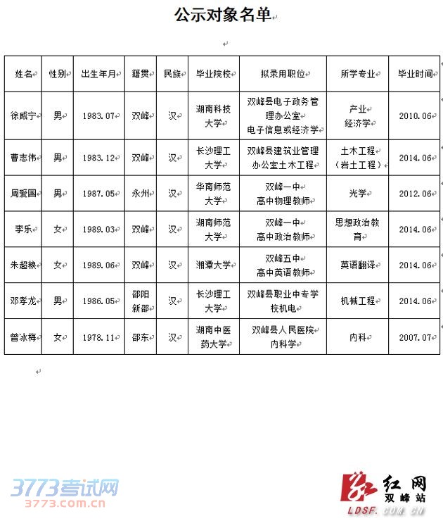 根据《双峰县2012-2014年引进高学历层次人才实施方案》的要求,我县2014年引进高学历层次人才工作已产生了7名拟聘用人员名单,现予以公示。公示时间为2014年11月20日至11月28日。公示期内,如发现拟聘用人员中有不符合聘用条件的,可以书面或当面的方式向县人才工作领导小组办公室(设县委组织部人才办)举报。举报问题属单位反映的,由单位负责人签名并加盖公章;属个人反映的,需注明真实姓名、联系单位、住址、电话。县人才工作领导小组办公室为举报人严格保密。