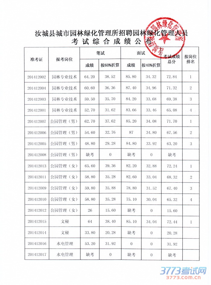 [图文]2014年湖南汝城县城市园林绿化管理所招聘园林绿化管理综合成绩公布