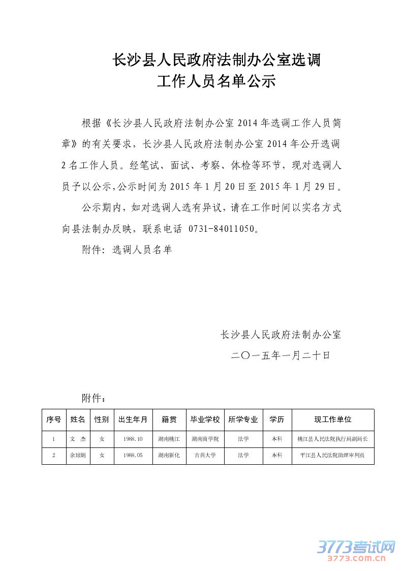 [图文]湖南长沙县人民政府法制办公室选调2014名单公示