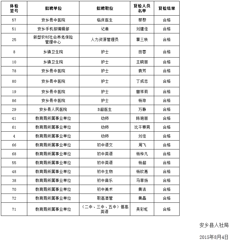 [图文]2015湖南安乡县事业单位招聘复检结果公示
