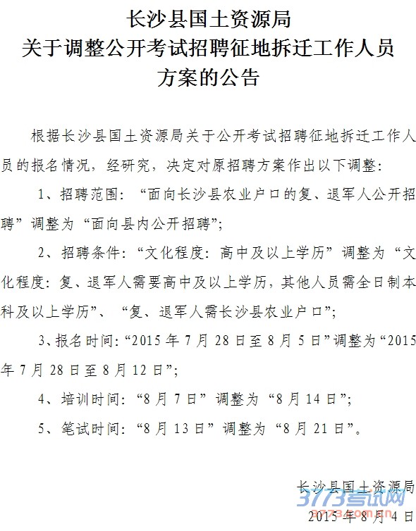 [图文]2015年湖南长沙县国土资源局调整考试招聘征地拆迁人员公告