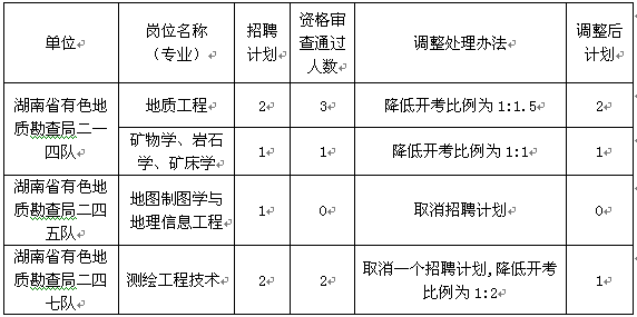 《2015年湖南省有色地质勘查局所属事业单位公开招聘方案》于7月17日在湖南省人力资源和社会保障厅网站向社会公开发布,按照方案要求,7月29日-7月31日组织了公开报名和资格审查。因部分岗位无人报名或报名人数达不到开考比例,于8月5日发布了延长报名公告,延长报名时间至8月14日截止。仍有部分岗位无人报名或报名人数达不到开考比例。根据工作需要,经公开招聘工作领导小组集体研究,报省人社厅同意,作如下处理(详见下表):