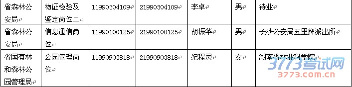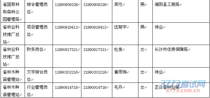根据《湖南省2015年度考试录用公务员工作实施方案》,经报名、笔试、资格审查、面试、体检、考察等程序,省林业厅拟录用2015年度公务员及参照公务员法管理事业单位工作人员李静、贺勇、成彬、贺禹霖、李杨阳、廖凌娟、赵聆君、李向波、何理、李卓、胡振华、纪程灵、吴欢、伍翔宇、杜佳、黄雨珣、毛丹,现公示如下: