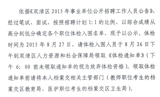 [图文]2015湖南双清区事业单位招聘体检名单公示