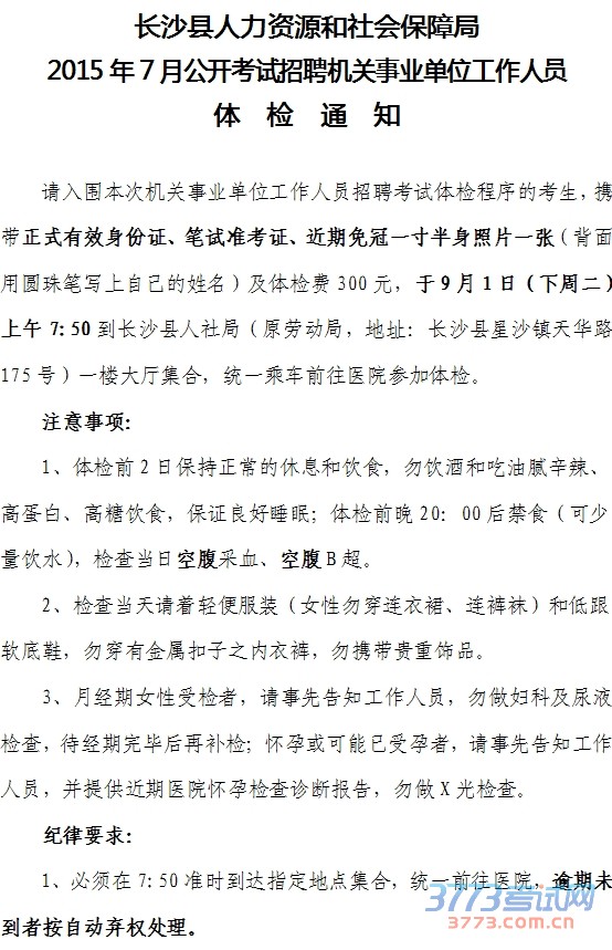 [图文]2015年7月湖南长沙县机关事业单位考试招聘体检通知