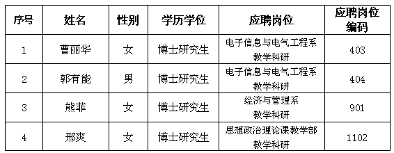 长沙学院2015年公开招聘(选调)教学、管理人员,经报名、资格审查、笔试、考核、体检、考察等程序,按照《招聘简章》相关规定拟录取以下4人,现公示如下,公示期为7个工作日,从2015年9月29日至2015年10月13日。