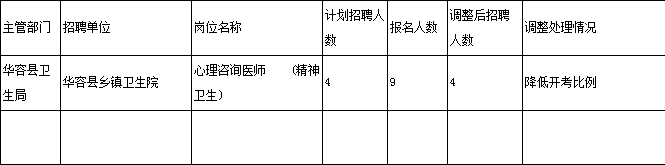 华容县2015年下半年事业单位公开招聘专业技术人员报名工作已经结束,根据《岳阳市事业单位公开招聘人员实施办法(试行)》(岳人社发〔2013〕124号)和《华容县2015年下半年事业单位公开招聘专业技术人员公告》的规定,综合报名情况,本次招聘共有1个岗位没有达到规定的开考比例。为了顺利开展后续招聘工作,经招聘单位申请,主管部门同意并报市人社局核准,决定对没有达到开考比例的招聘岗位计划数作如下调整。其中,调整降低开考比例的岗位1个,具体岗位调整情况: