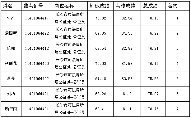 长沙市司法局所属公证处公开招聘,经报名、资格初审、笔试、资格复审、考核等程序,以下7人进入体检,现公示如下。