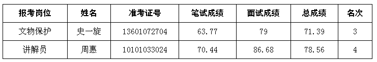 长沙市园林管理局所属事业单位公开招聘,由于文物保护岗位总成绩第2名的考生、讲解员岗位总成绩第1名的考生自动放弃体检资格,且讲解员岗位总成绩第3名的考生自动放弃递补体检资格,根据招聘简章规定,按总成绩排名从高到低递补2人进入体检。