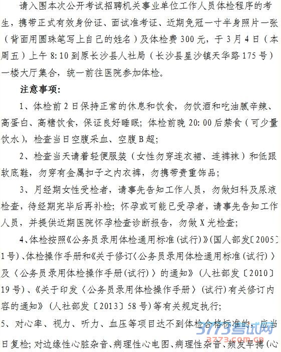[图文]湖南长沙县机关事业单位2016年1月招聘体检通知