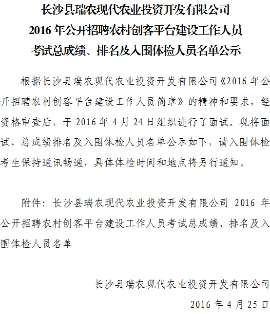 [图文]2016长沙招聘农村创客平台建设人员总成绩、排名及体检名单公示