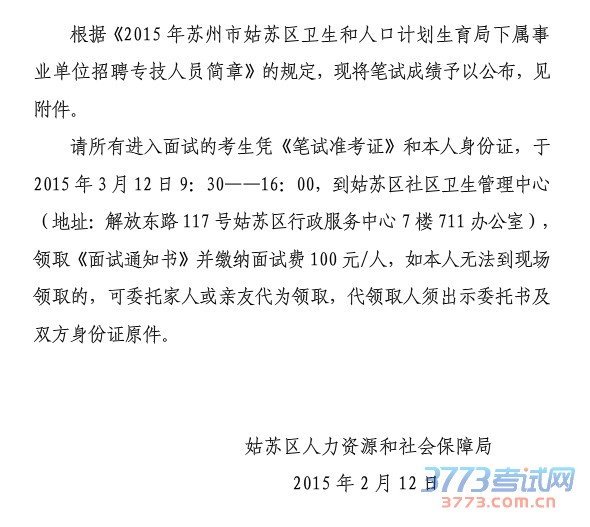 2015年苏州市姑苏区招聘专技人员笔试成绩公布及面试通知