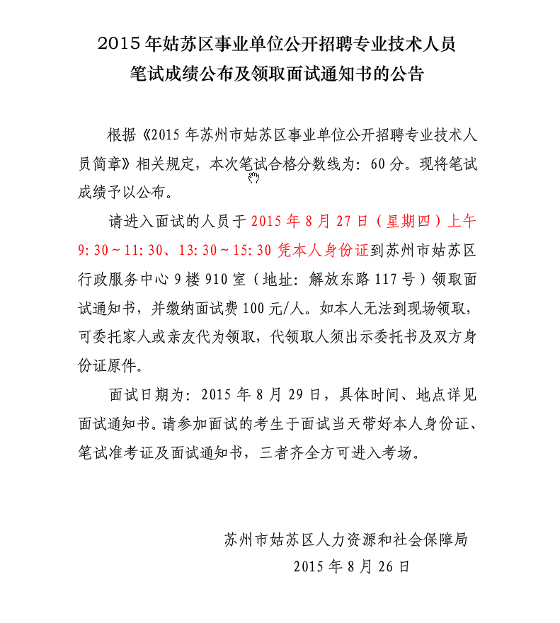 江苏姑苏区事业单位2015招聘笔试成绩及面试通知书领取公告