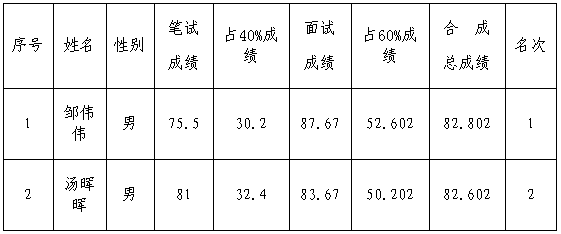 根据《吉安仲裁委招聘公告》和《吉安仲裁委员会2016年公开招聘人员笔试面试通知》要求,现将笔试、面试成绩4:6比例合成百分制总成绩,按照高分到低分公布如下: