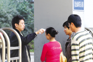 考生入考场前接受体温检测 ■本报记者 蔡敏强 摄