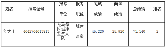 本次我区城建监察大队职位第1名考生在考察环节自动放弃,依次等额递补该职位第2名考生进入体检: