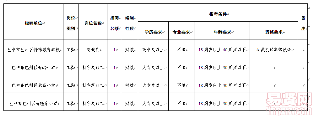 [图文]2014年巴中市巴州区中小学招聘中小学校工勤人员职位表