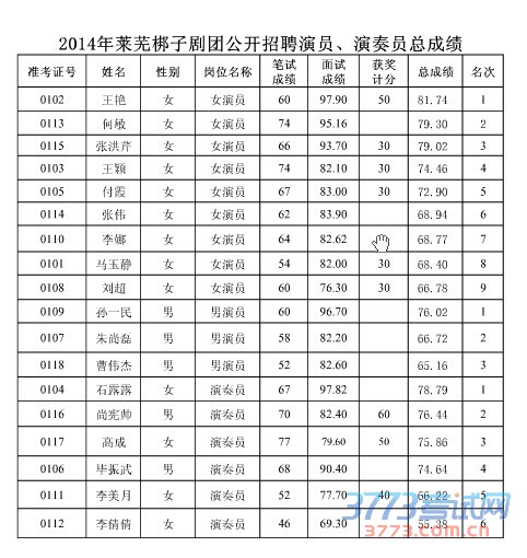 [图文]2014年山东莱芜梆子剧团招聘演员/演奏员总成绩