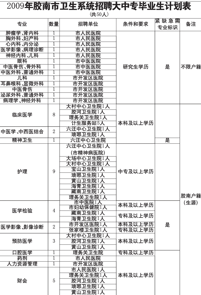 记者从市人事局了解到 ,今年胶南市卫生系统公开招聘大中专毕业生50名,符合条件者可于9月5日至7日进行报名。