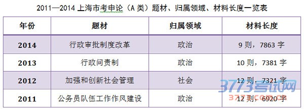 今年上海市考申论(A类)共7则材料,以十八届三中全会《中共中央关于全面深化改革若干重大问题的决定》内容为始,以十八届四中全会《中共中央关于全面推进依法治国若干重大问题的决定》内容为结束。材料比较容易理解,大量引用案例,以上海本地案例为主,给考生充分提供了“社会治理创新”这一主题的全景式画卷。内容包括问题阐述、原因分析、对策表述等,而且基本上每则材料对应一个问题,条理清晰。