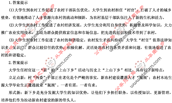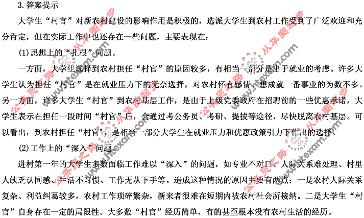 3.根据材料6—9,谈谈当前大学生“村官”还存在着哪些问题。(20分)