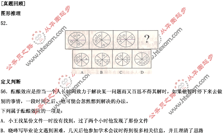 综观2009年辽宁省公务员考试行政职业能力测验试题,整体难度跟去年相比稳重有升,这也符合现在公务员考试的出题趋势。具体来说,图形推理部分由于题量下降,考点跟国考靠拢,比较分散,但题目本身不难。定义判断部分选项迷惑性比去年有小幅上升,但掌握考点,也不难选择。类比推理部分采用了国考的题型,难度有所增加,但掌握了好六大二元关系也不难解决。演绎推理部分果然大量出现了削弱题型,一共有4道题,华图马九鹏老师在辽宁华图的冲刺班中跟考生强调了这一点。另外就是加强题型大量出现,三道支持型,一道原因型,此外还有两道推出型题。总体来,2009辽宁省公务员考试行政职业能力测验题型分布比较集中,难度不大,跟去年比稍有下降。下文为华图教研中心提供了判断推理真题及答案解析供考生核对参考。