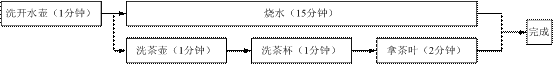 【例1】妈妈给客人沏茶,洗开水壶需要1分钟,烧水需要15分钟,洗茶壶需要1分钟,洗茶杯需要1分钟,拿茶叶需要2分钟,依照最合理的安排,要几分钟就能沏好茶?【2009年山西省公务员考试行政职业能力测验真题-105题】