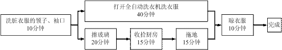 [华图解析]时间统筹:打开全自动洗衣机洗衣服的同时完成擦玻璃、收拾厨房、拖地的工作。总共需要10+20+15+15+10=70(分钟)