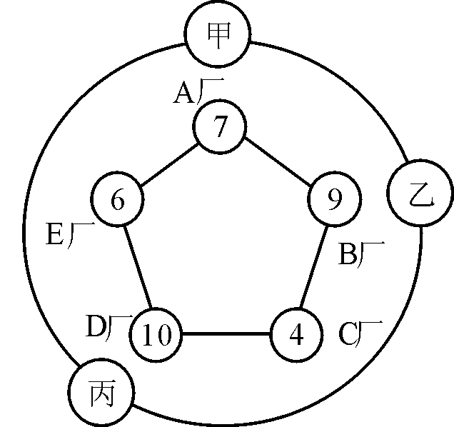 [解一]设三辆汽车分别为甲、乙、丙车;五个工厂分别为A、B、C、D、E厂,则最初状态甲、乙、丙三车上人数为0,五工厂分别有人7、9、4、10、6人。我们在五个工厂都减少1名装卸工时,五工厂共减少5人,而每辆车上的人数各增加1人,车上共增加3人,所以装卸工的总人数减少2人。当车上增加到4人,C厂剩余的人数为0,此时每辆车上的人数每增加1人,车上共增加3人,而五工厂共减少4人,所以装卸工的总人数仍减少。当车上增加到6人,C、E厂剩余的人数为0,此时每车上的人数每增加1人,车上共增加3人,而五工厂共减少3人,所以装卸工的总人数不变。当车上增加到7人,A、C、E厂剩余的人数为0,此时每辆车上的人数如果再每增加1人,车上共增加3人,而五工厂共减少2人,所以装卸工的总人数增加。所以当车上的人数为6人(或7人)的时候,装卸工的总人数最少。如果每个车上有6个人,A、B、C、D、E厂剩余人数分别为1、3、0、4、0,三辆车上共有18人,总共需装卸工26人。如果每个车上有7个人,A、B、C、D、E厂剩余人数分别为0、2、0、3、0,三辆车上共有21人,总共也需装卸工26人。