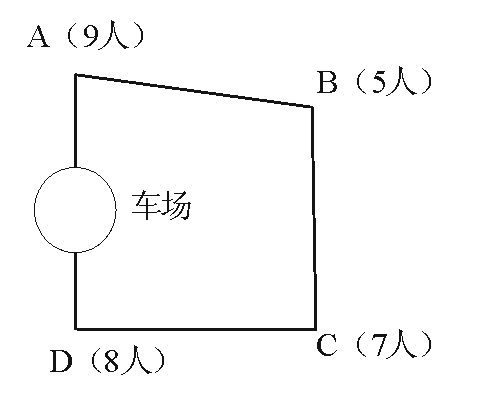 【例12】如图,某车场每天派出2辆汽车,经过A、B、C、D四个点,各点分别需要装卸工9人、5人、7人、8人。装卸工可以固定在车间,也可随车流动。问:至少需要派多少装卸工才能满足装卸要求? ()