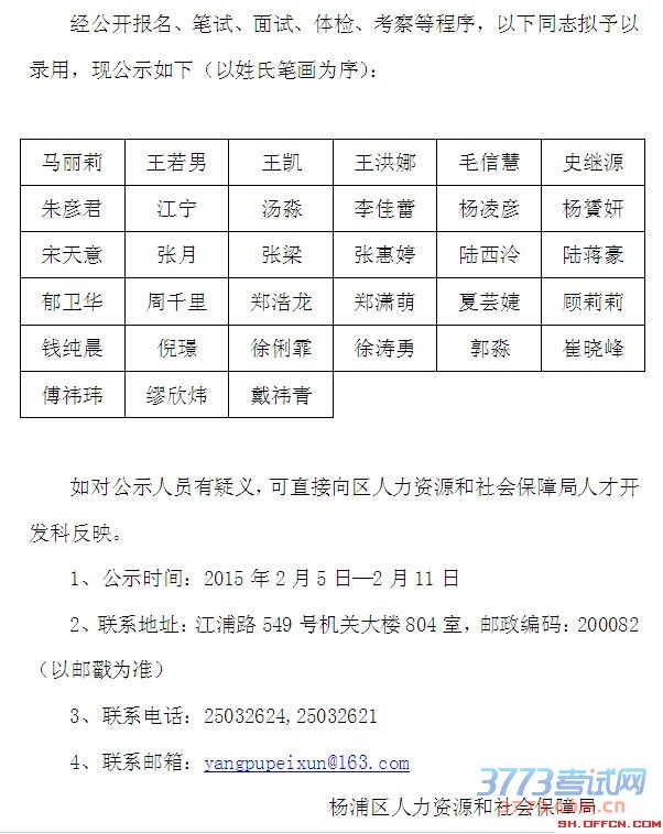 [图文]2014下半年上海杨浦事业单位工作人员拟录用人员公示