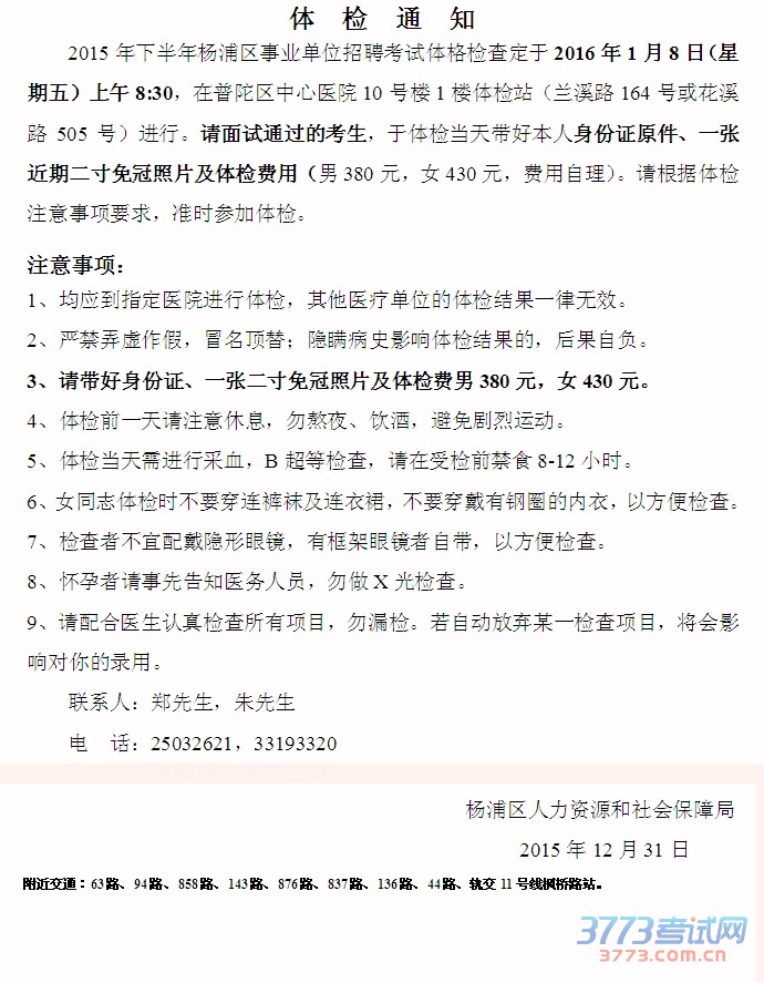 [图文]2015下半年上海杨浦区事业单位招聘考试体检通知