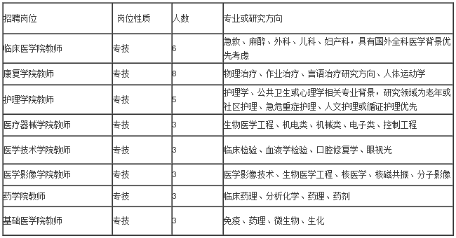 学校拥有一支教学资历深厚、医学技术及工程实践经验丰富的专任教师队伍,教授、副教授职称教师的占比达30%;并有一批东方学者、浦江学者、启明星计划及曙光计划等高水平中青年专家,学校开设的本、专科专业均具有鲜明的医学技术、临床医学、医疗器械等行业特色,活跃在医疗卫生、医疗器械等行业的历届毕业生深得用人单位欢迎,近三年学生就业率持续更高达98%以上,专业对口率高、稳定性强。学校现为了进一步化师资队伍结构,特招聘以下岗位人员。