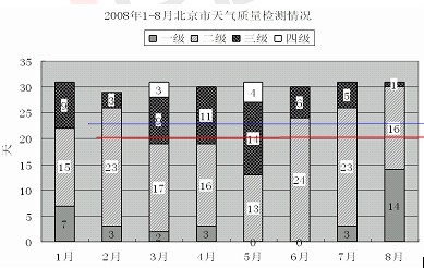 在2008年8月8日至24日奥运会期间,北京市的空气质量不仅天天达标,而且有10天达到一级。全面兑现了对奥运会空气质量的承诺。下图是2008年1—8月北京市大气质量检测情况。图中一、二、三、四级是空气质量等级,一级空气质量最好,一级和二级都是质量达标天气。2008年北京市的空气质量控制目标是全年达标天数累计达到256天。