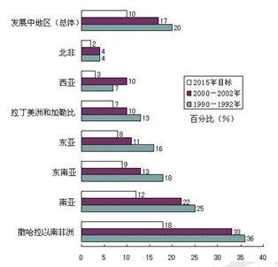 1990至1992年和2000至2002年全球发展中地区饥饿人口的比例示意图