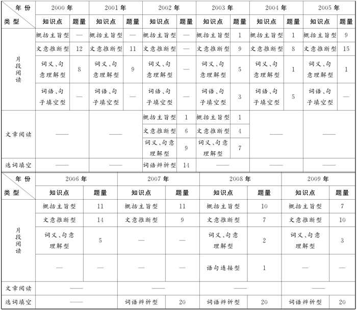2000年~2009年行政职业能力测验中,言语理解与表达部分的命题情况如下表所示: