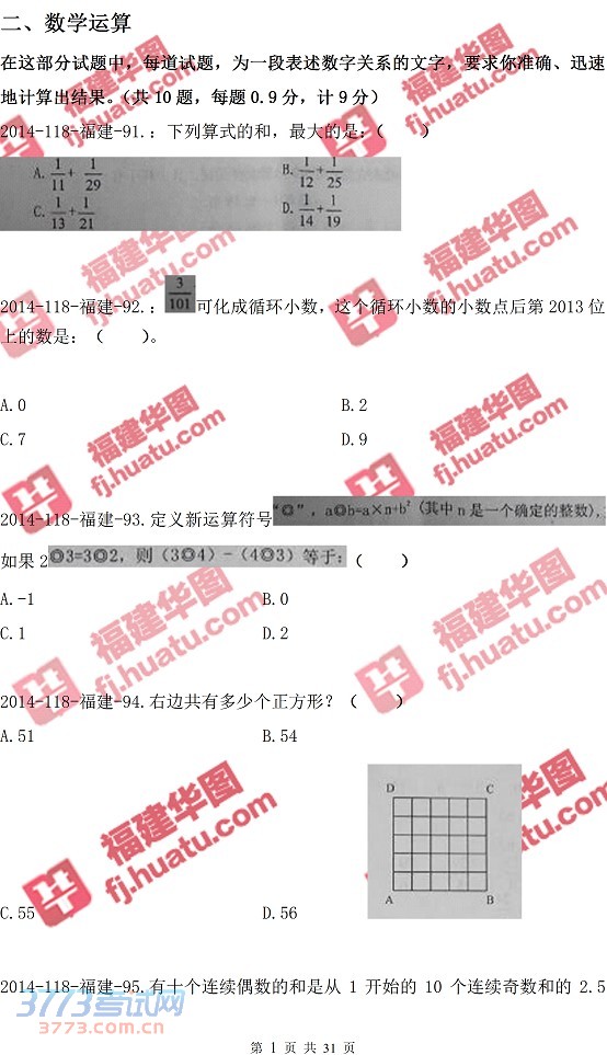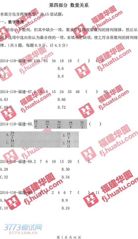[组图]2014年福建省事业单位(11.8联考)招聘真题:数量关系真题