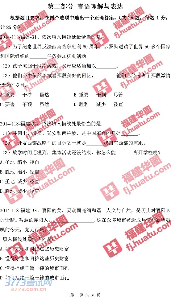 [组图]2014年福建省事业单位(11.8联考)招聘真题:言语理解真题