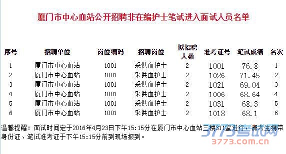 [图文]2016福建厦门市中心血站招聘非编护士面试名单公示